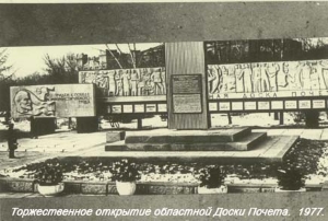 Состоялось торжественное открытие областной Доски Почета у стелы с орденами Ленина и Трудового Красного Знамени. На митинг, посвященный этому событию, собрались передовики производства, руководители предприятий и учебных заведений. На Доску Почета были занесены 25 передовых коллективов. Рельеф Доски Почета, по задумке авторов, олицетворял крепкий и нерушимый союз рабочего класса и крестьянства.