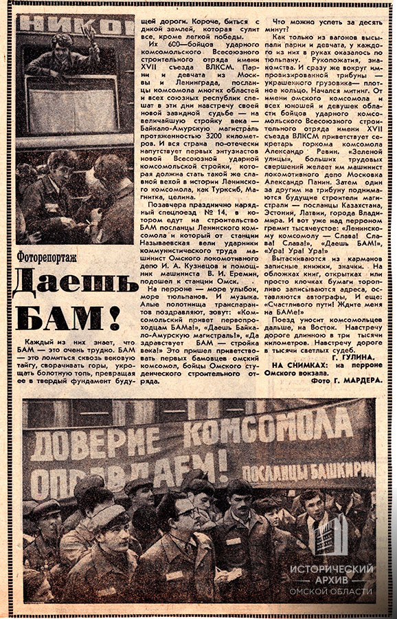 Статья Г. Гулиной «Даешь БАМ!» о встрече на Омском вокзале спецпоезда с бойцами ударного комсомольского Всесоюзного отряда им. XVII съезда ВЛКСМ.