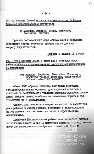 Постановление бюро Омского обкома КПСС от 15 ноября 1974 года «Об участии Омской области в строительстве Байкало-Амурской магистрали».