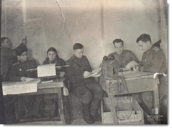 | Начальник оперотдела корпуса гв. подполковник А.П. Дмитриев (сидит 1-й слева) в оперотделе штаба. 2 марта 1944 г. |
