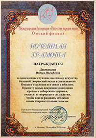 И.И. Дружинская трижды награждалась дипломом I степени «За высокое исполнительное искусство», награждена грамотой Министерства культуры Омской области, дипломом лауреата Международной ассоциации «Искусство народов мира» и др. В 2010 г. Инессе Иосифовне присвоены почетные звания: «Заслуженный деятель искусств» Международной ассоциации «Искусство народов мира», «Почетный член Омской региональной общественной организации Польское культурно-просветительское общество «Rodsina – семья».
