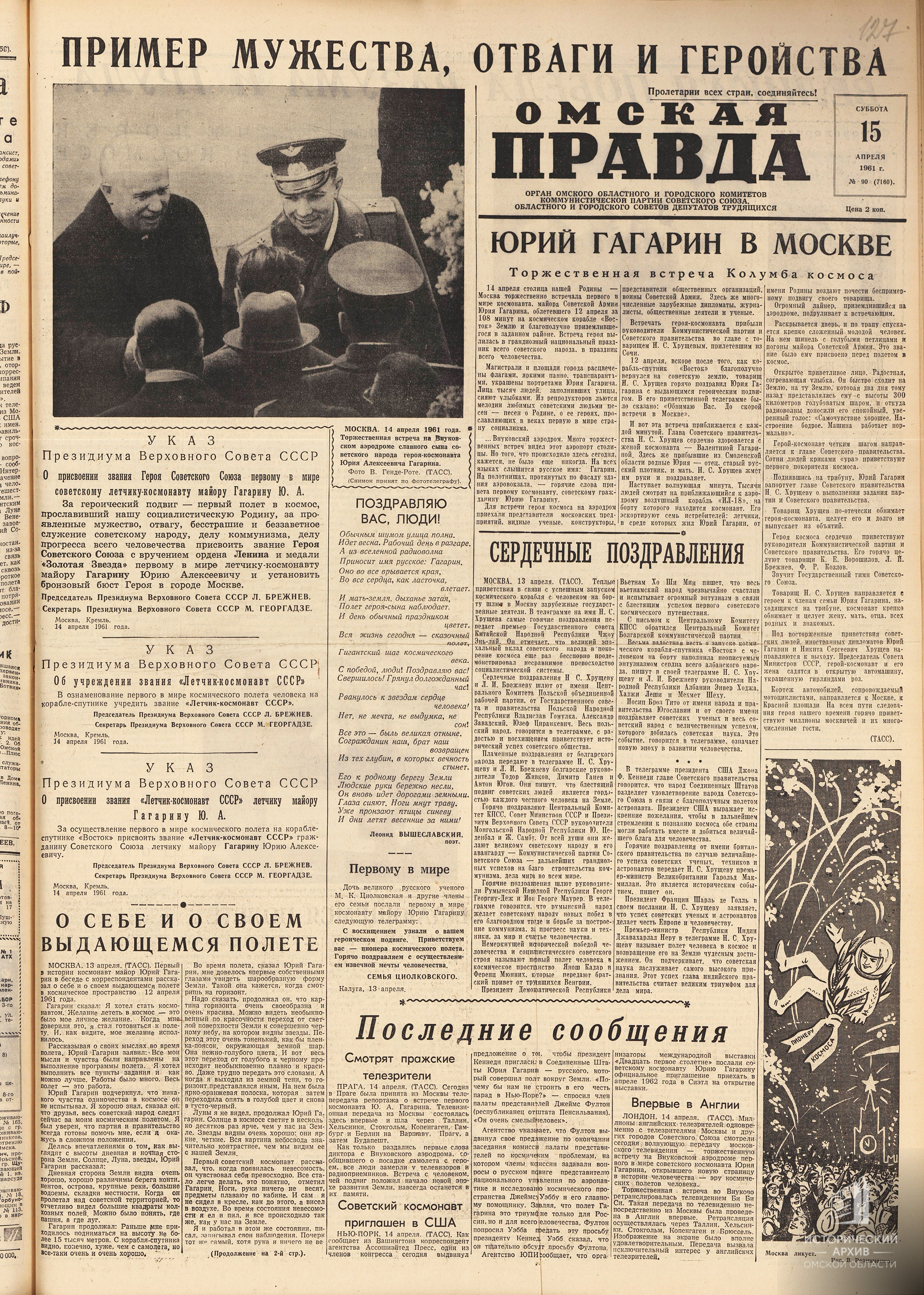 В газете «Омская правда» за 14 апреля 1961 года помещено интервью с Ю.А.Гагариным, в котором он повествует о своём полете, наблюдениях, сделанных в космосе, и интервью с отцом космонавта Алексеем Ивановичем Гагариным.